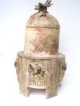 2012Keramisch object speels deels gedraaide tempel in natuur tinten geglazuurd. Symbolische versieringen.en toevoegingen